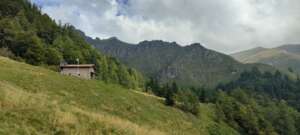 Abbarbicata sotto i Corni del Diavolo, la Baita di Prada era un antico ricovero estivo per i pastori, ora diroccata.