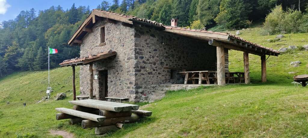 Proseguendo lungo la cresta ci si porta alle prime rocce dei corni di Mura, mantenendosi a destra, dopo un breve tratto di salita, si entra in piano nella valle, che si apre ripida e a semicerchio, si raggiunge l’antica Baita di Prada (m. 1.709 – h. 4,00).